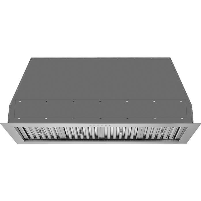 The AEG 48-inch insert range hood features 3 fan speeds, a 900 CFM motor, LED lighting, and stainless steel baffle filters.