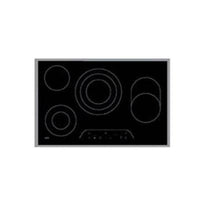 This 76 cm/30" wide black ceran electric cooktop with stainless steel trim features four electronically controlled hi-lite quick heating elements, touch controls, residual heat indicators, three expandable elements, a casserole/multi-purpose cooking zone, a safety lock, an automatic switch off function, a timer for all elements and a 2" depth which allows for easy installation over oven or cabinets.