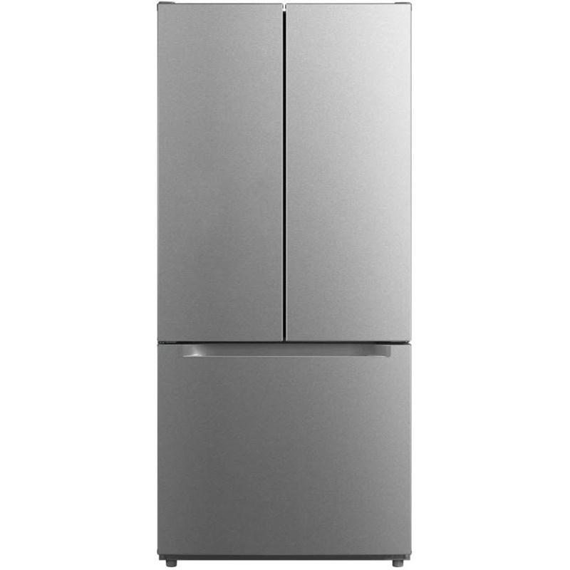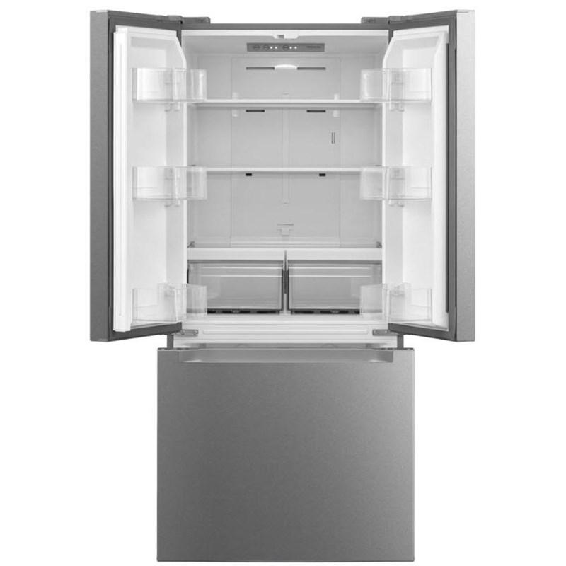This freestanding french 3-door refrigerator features LED lighting, glass shelve and a total capacity of 18.4 cu. ft.