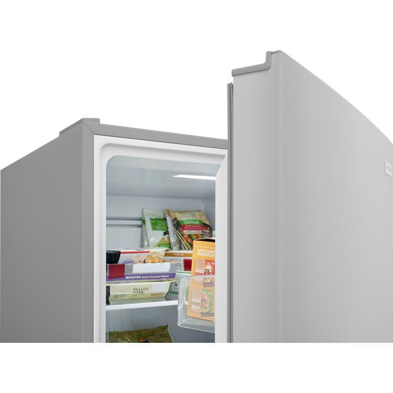 The Frigidaire upright freezer features a 21.1 cu. ft. capacity, glass shelves, and interior lighting for clear and convenient storage.