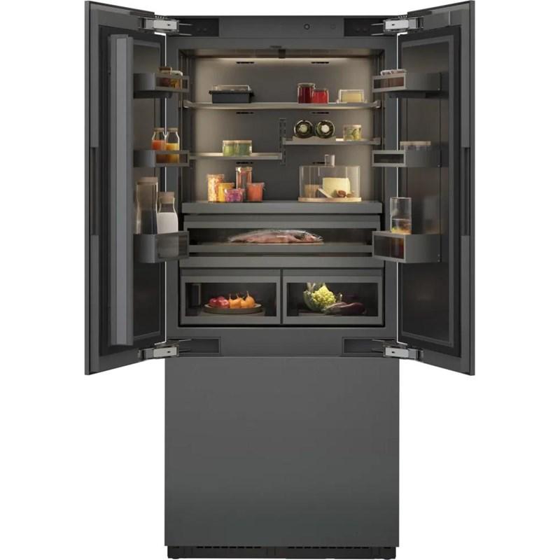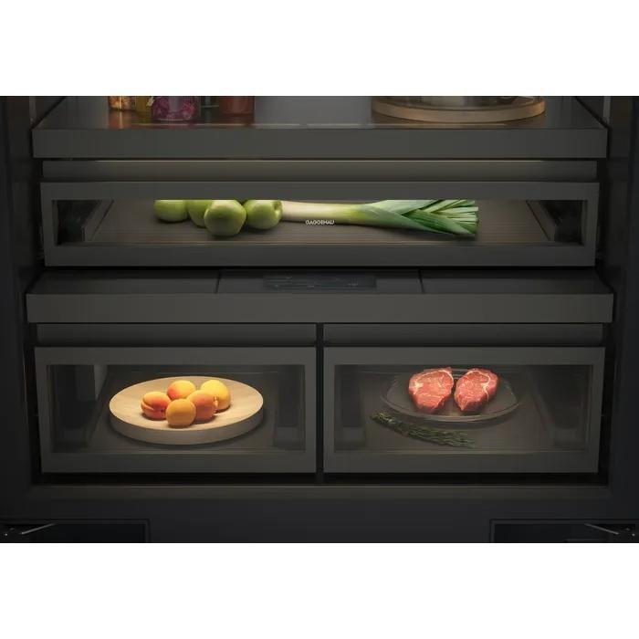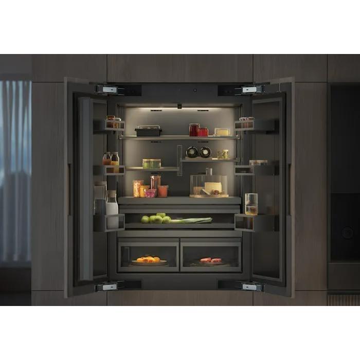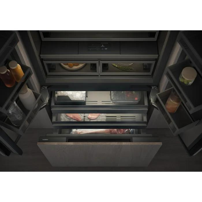 The 400 Series Vario Built-In 3-Door Fridge-Freezer with bottom freezer (36") combines sleek design with professional-grade functionality. Featuring a Softclose® flat hinge and a dark brushed stainless steel interior with anthracite aluminum accents, it offers a refined aesthetic. Its warm, glare-free LED lighting enhances food presentation, while the spacious freezer includes an integrated ice maker. A professional freshness system with five climate zones and an intuitive touch display ensures precision and ease of use.