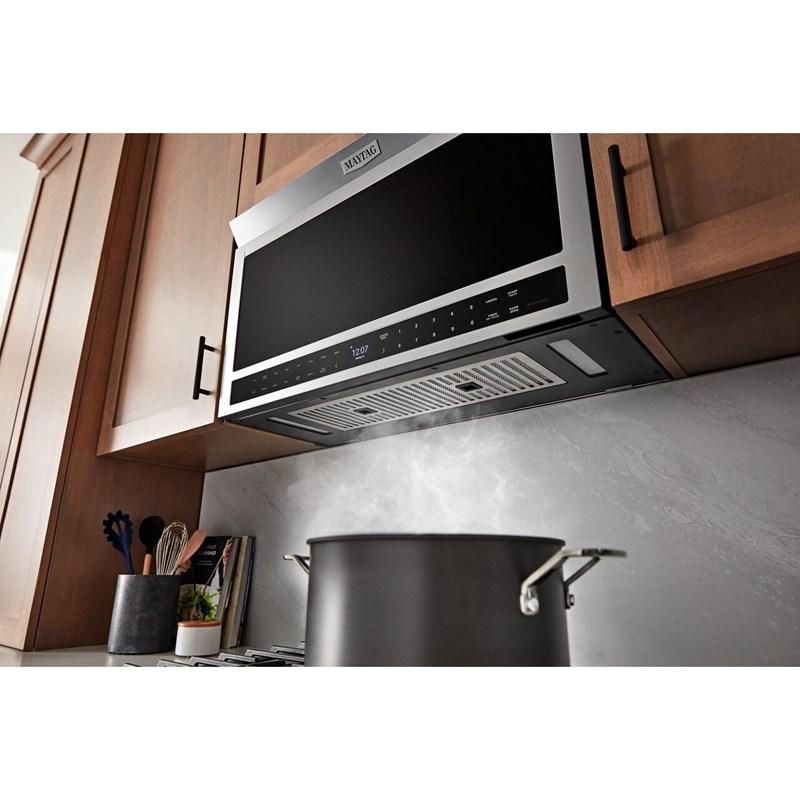 Maytag 30-inch over-the-range microwave oven with ventilation system and auto defrost.