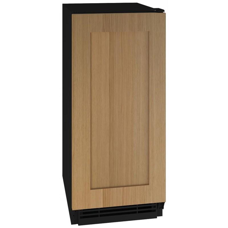 U-Line 15-inch Crescent Ice Maker with a Stainless Steel solid door and a reversible door swing. It produces and stores up to 25 lb (11 Kg) of ice per day and makes crescent-shaped cubes. This ice machine features a white interior, a daily ice production is approximately 4 times greater than the average household refrigerator and four adjustable leveling legs. No drain required. Model with integrated door finish that accept a custom door panel to match your surrounding cabinetry (sold separately).