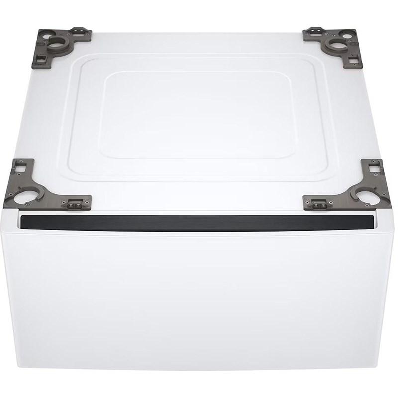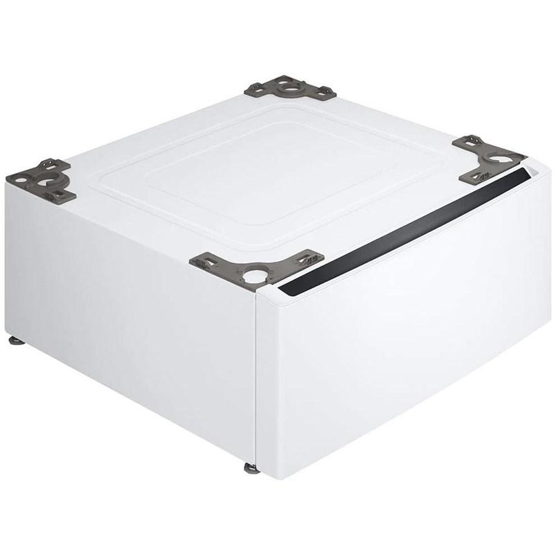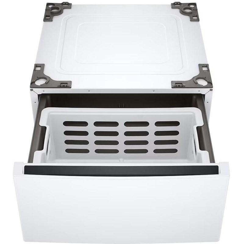 This LG 27-inch pedestal storage drawer offers extra storage space with a basket for organization elevating appliances for comfortable loading and unloading.