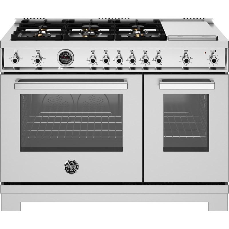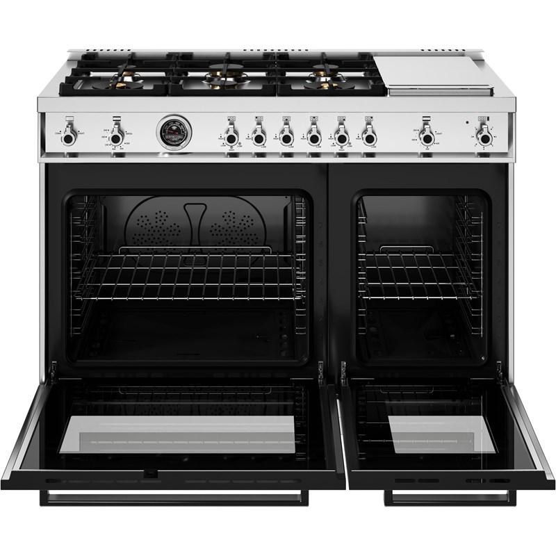 The high-efficiency maintop with 6 brass burners and electric griddle features 2 dual ring 19,000 BTU power-burners that boil water in under 6 minutes (best in class), and 4 additional MonoBloc burners of variable size and power to suit every style of cooking, with delicate simmer at 750 BTUs. The stainless steel griddle with integrated cover provides additional cooking options.The 4.7 cubic feet main oven cavity is the largest in its class, with dual convection fan for balanced airflow and even temperature baking and roasting on 7 shelf levels. The elegant large temperature gauge monitors the actual temperature in the oven. The extra wide infrared gas broiler is ideal for grilling and searing at high heat. The 2.4 cubic feet auxiliary oven is perfect for smaller dishes and for warming. Both ovens include convenient features such as smooth telescopic glides for the oven shelves and soft-close doors. The edge-to-edge interior oven glass door maximizes interior volume and can be wiped clean without effort.