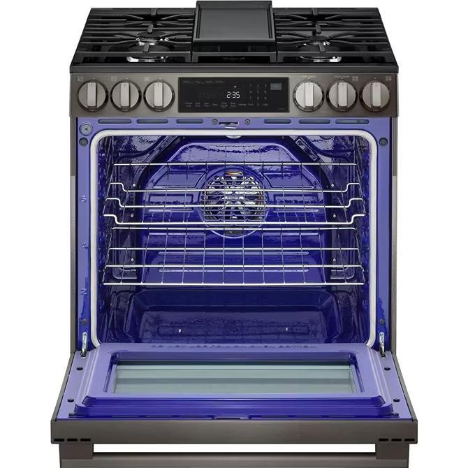 LG 6.3 cu ft. smart wi-fi enabled ProBake Convection® InstaView® gas slide-in range with Air Fry. It features the ThinQ® technology with Proactive customer care, an EasyClean® + self clean oven and a 3-in-1 element.