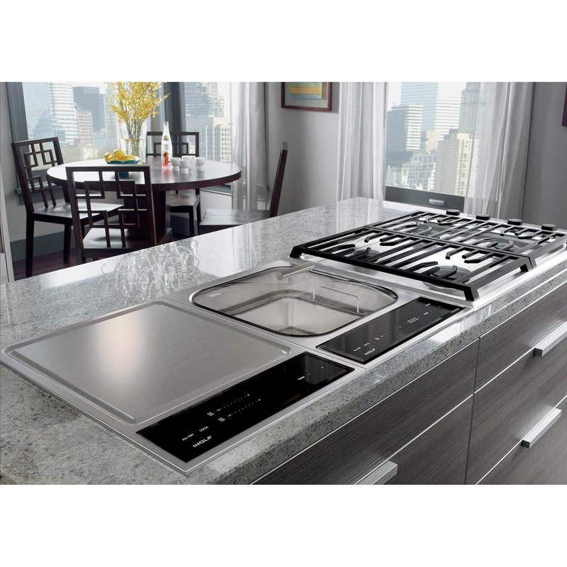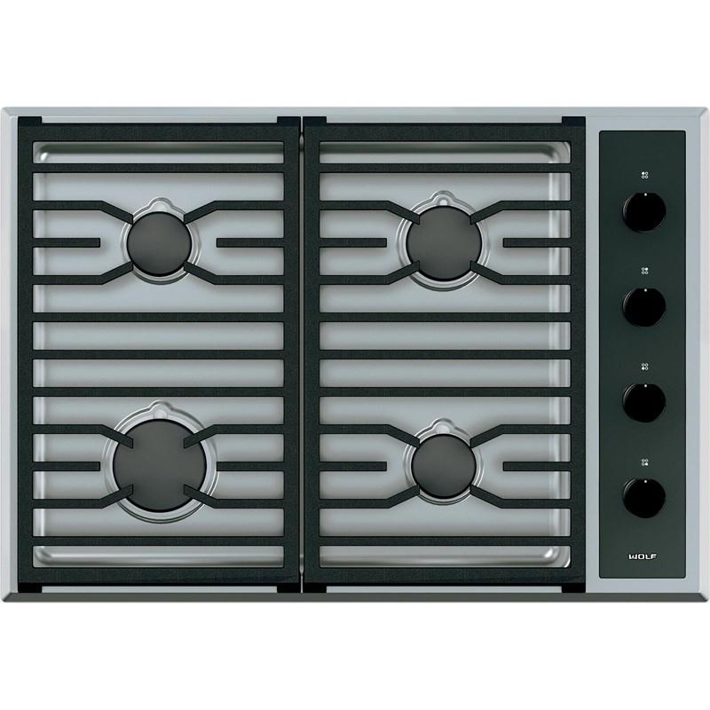 Wolf 30-inch gas cooktop. Four dual-stacked burners give you greater control over a wide range of heat output, from 18,000 BTU for restaurant-quality sears and 25% faster boil times to a mere breath of flame for gentle simmering of soups and sauces. A seamless stainless steel burner pan makes cleanup easy. Porcelain-coated, cast iron grates let you slide pots easily on and off heat, or from one burner to another.