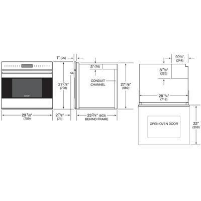Stainless steel control panel, Professional Model;Can be installed in a standard or flush inset application;Crafted of heavy-duty stainless steel;Dual convection oven with two fans for even heat distribution;Ten cooking modes—bake, roast, broil, convection, convection bake, convection roast, convection broil and proof—bake stone and dehydration modes require accessory;Cobalt blue porcelain oven interior;Large viewing, double-pane window and dual halogen interior lights;Three adjustable oven racks; one full extension easy glide, one full-extension door glide and one standard;Hidden bake element and recessed broil element;Temperature probe and broiler pan;Self-clean, delayed start, timed cook and Sabbath features;Balanced door hinge system for smooth opening and closing.Height