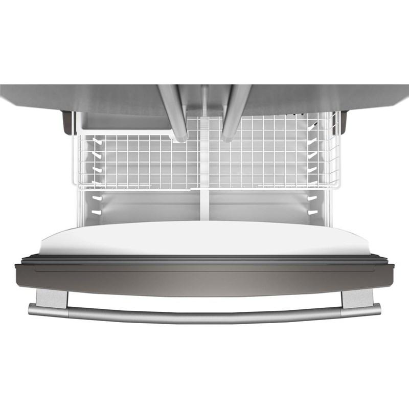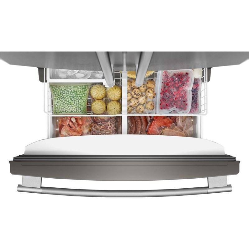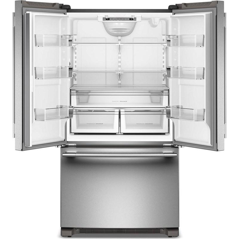 KitchenAid french 3-door refrigerator with crisper drawers and interior lighting.
