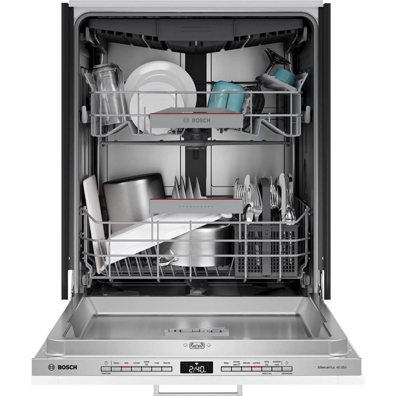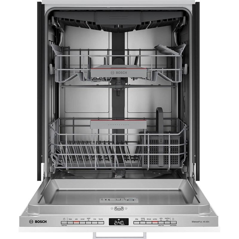 This Bosch 24-inch top control dishwasher features PrecisionWash®, PureDry®, Rackmatic®, and can accommodate up to 15 place settings. (Panel Sold Separately)