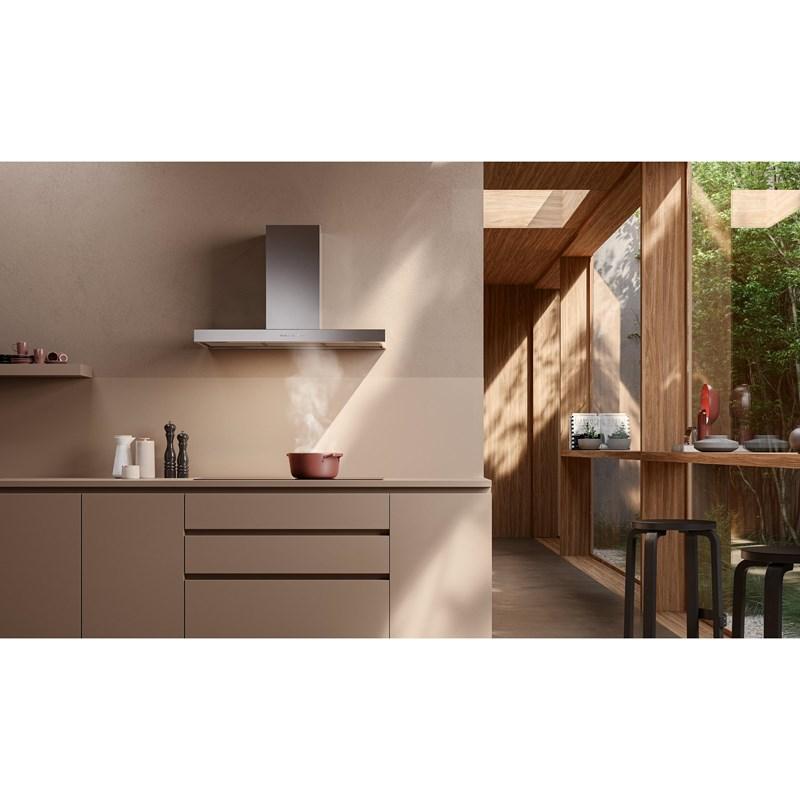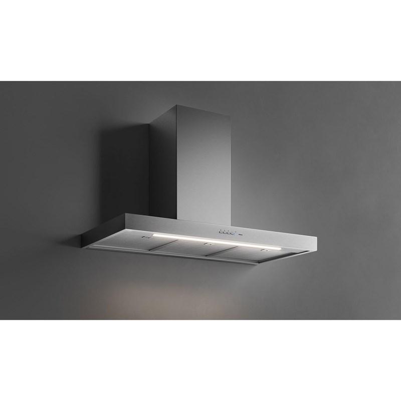 Falmec Mercurio Plus Range Hood features SRS Speed Reduction System, dimmable Dynamic Light (2700K–5600K), electronic controls, a removable metallic grease filter, and an optional charcoal filter for efficient and customizable kitchen ventilation.