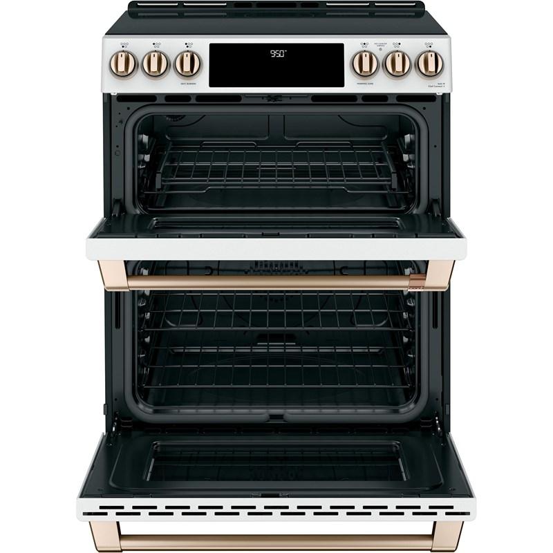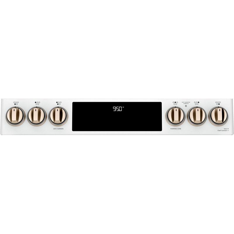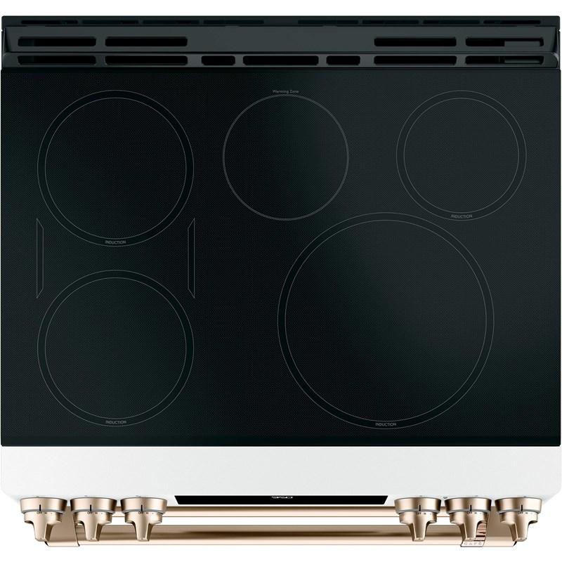 Café™ 30" Slide-in front control convection electric induction range with double oven. Stun guests by showing off your 11" 3,700-watt induction element, which uses chef-preferred induction cooktop technology to deliver precise heat to cookware only. Control your oven from any room in the house with your smartphone using Wifi Connect.