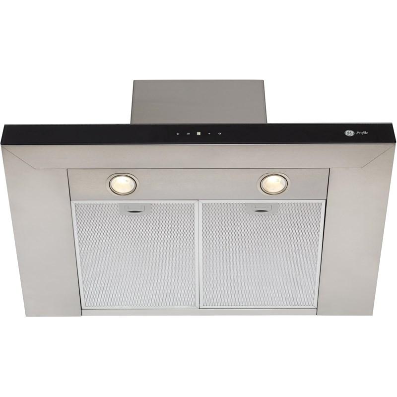 GE Profile 30" range hood features 600 CFM, 4-speed fan, dishwasher safe filter and Green LED display.