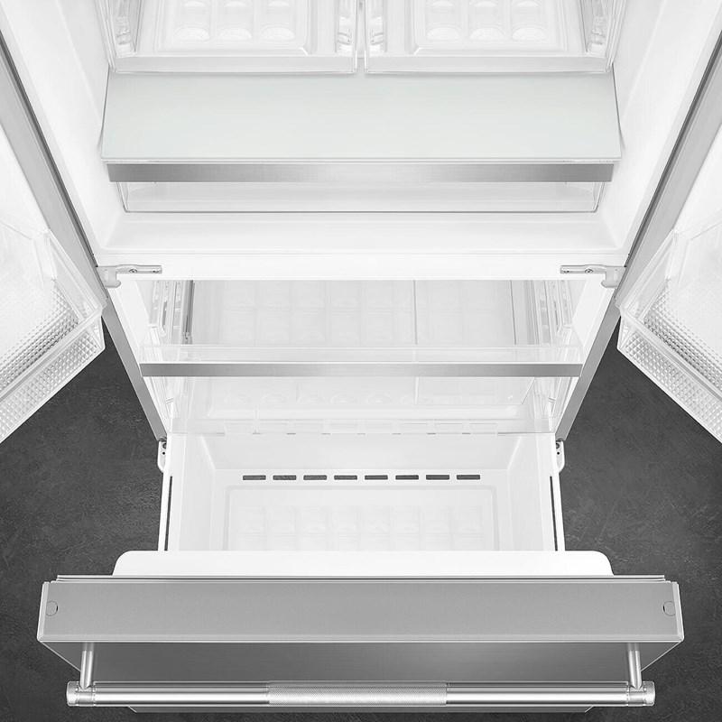 The Smeg French Door Refrigerator offers a sleek, modern design with a 30-inch width and a 16.0 cu. ft. capacity. It includes a convenient ice maker and water dispenser, ensuring you always have fresh ice and water on hand. This refrigerator combines style with functionality, making it a great fit for any contemporary kitchen.