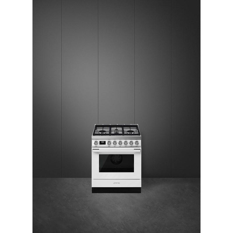 This Smeg 30-inch freestanding dual fuel range features True European convection, 10 cooking modes, adjustable thermostat and a 3.6 cu.ft. oven capacity.