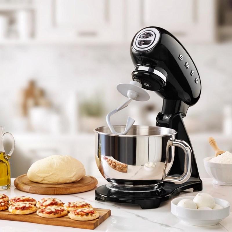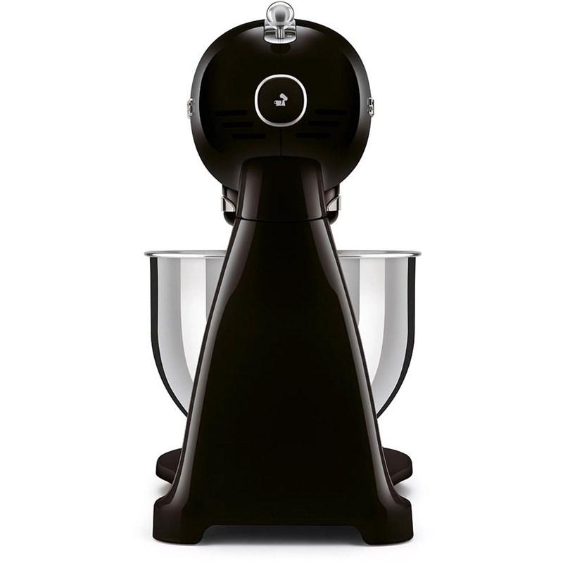 This Smeg 50's Retro Style Aesthetic mixer features electronic speed control, 600 W of power, a 5-quart bowl capacity, and a safety lock when the head is tilted up. This model features a glossy black finish.