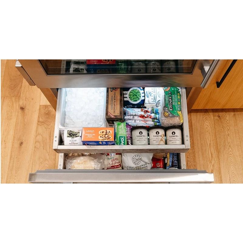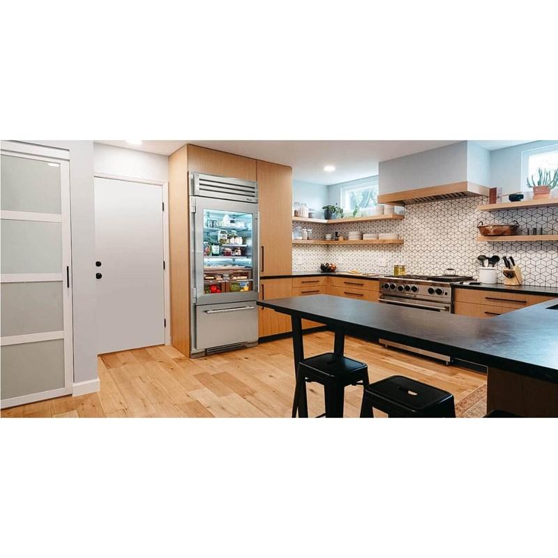 True Residential 36-inch bottom freezer refrigerator features internal ice maker, crafted glass door with stainless steel frame, ramp-up, showcase interior LED lighting and a total capacity of 22.6 cu. ft.