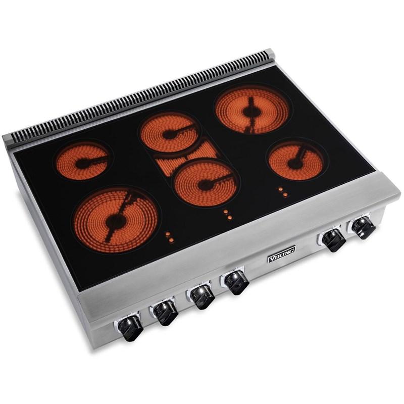Viking 36" 5 Series Electric Rangetop with QuickCook™ Surface Elements that feature innovative ribbon technology that allows them to reach full power in just three seconds. The SoftLit™ LED lights enhance the control panel's appearance and provide illumination for the knobs, adding a stylish touch to your cooking area.